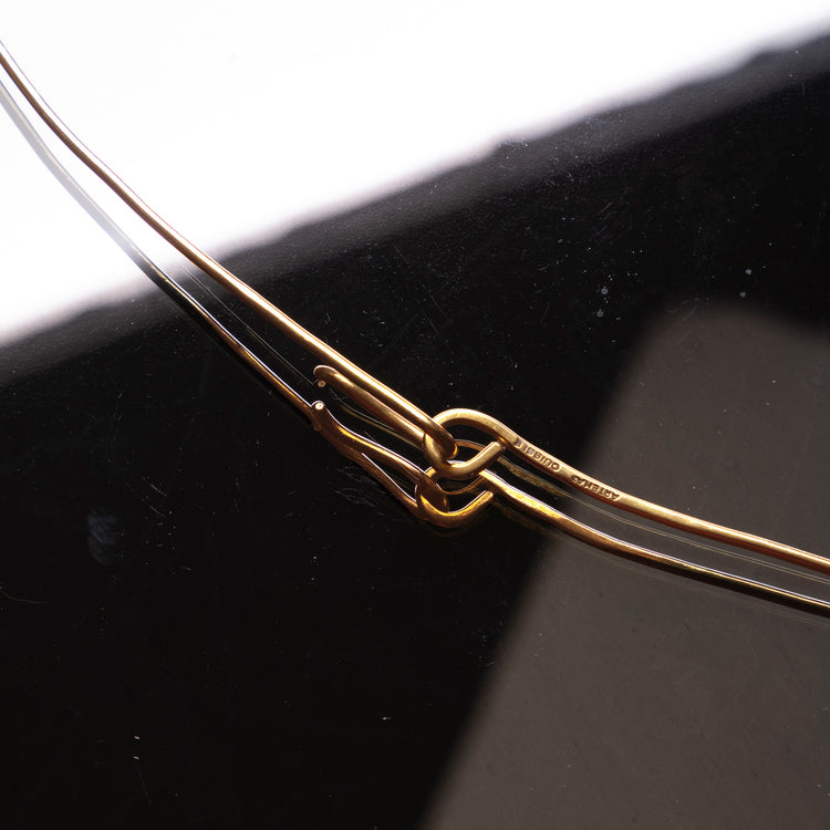 Hand forged rigid brass belt with hook closure.