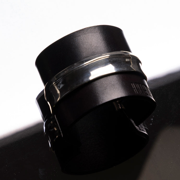 Bracelet: 2” wide leather held by ⅝” forged metal