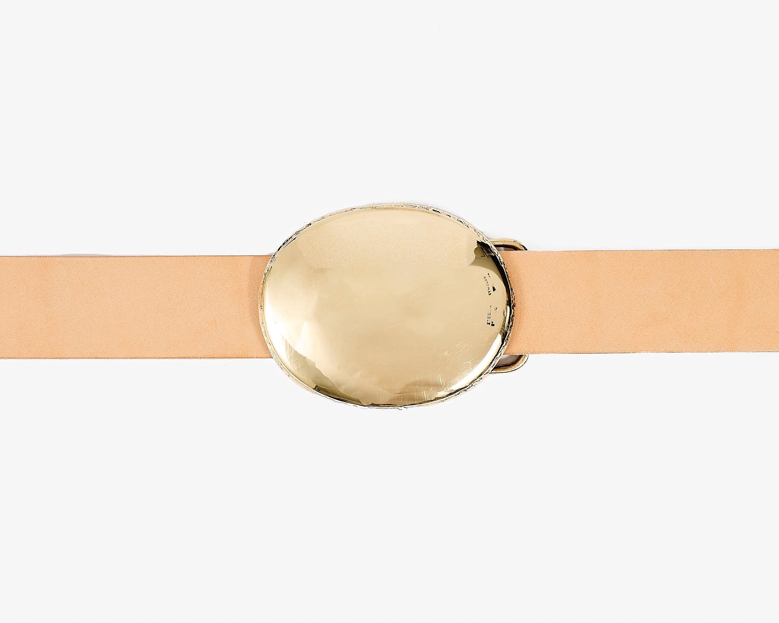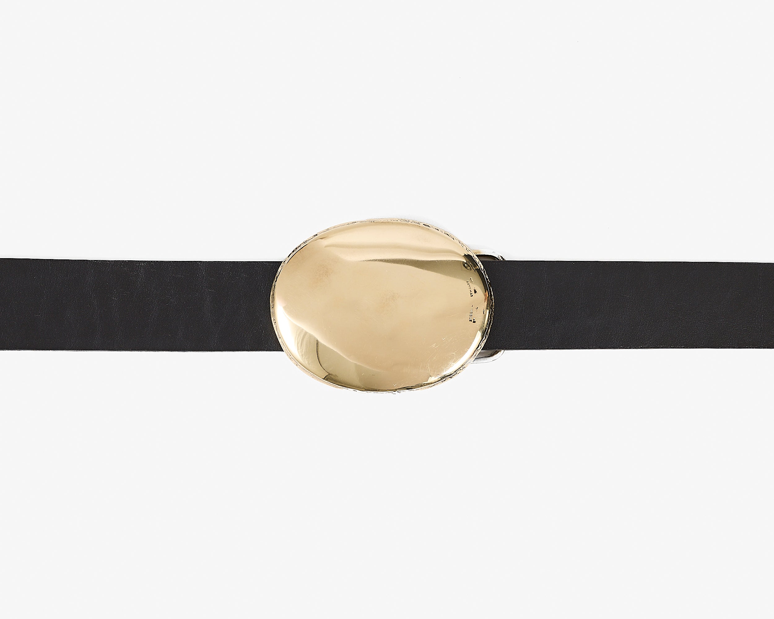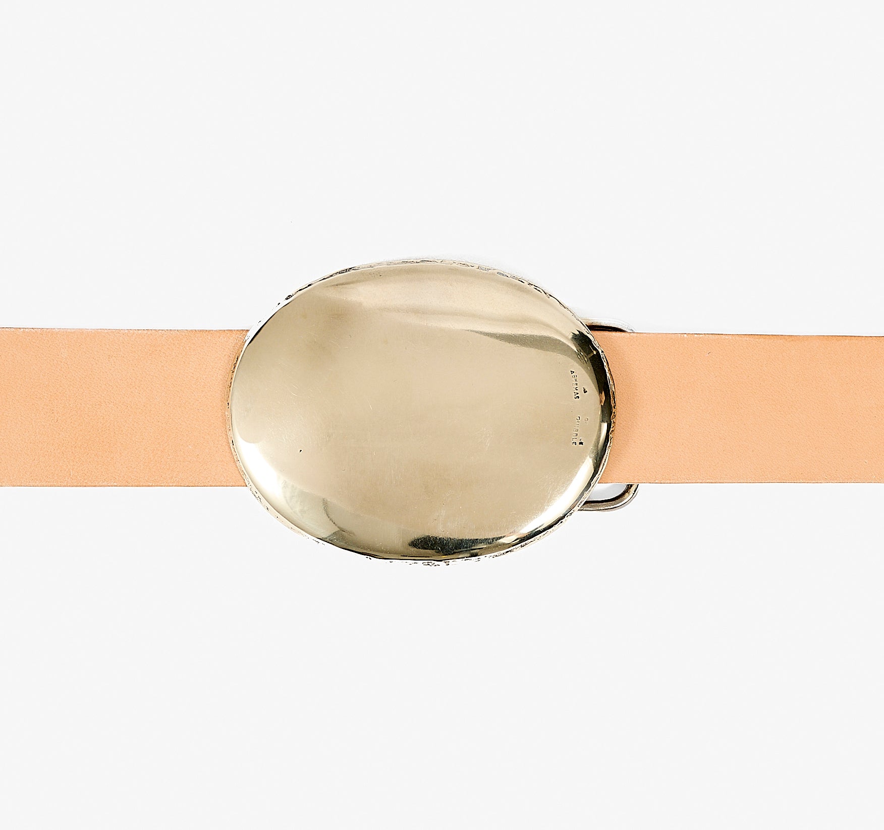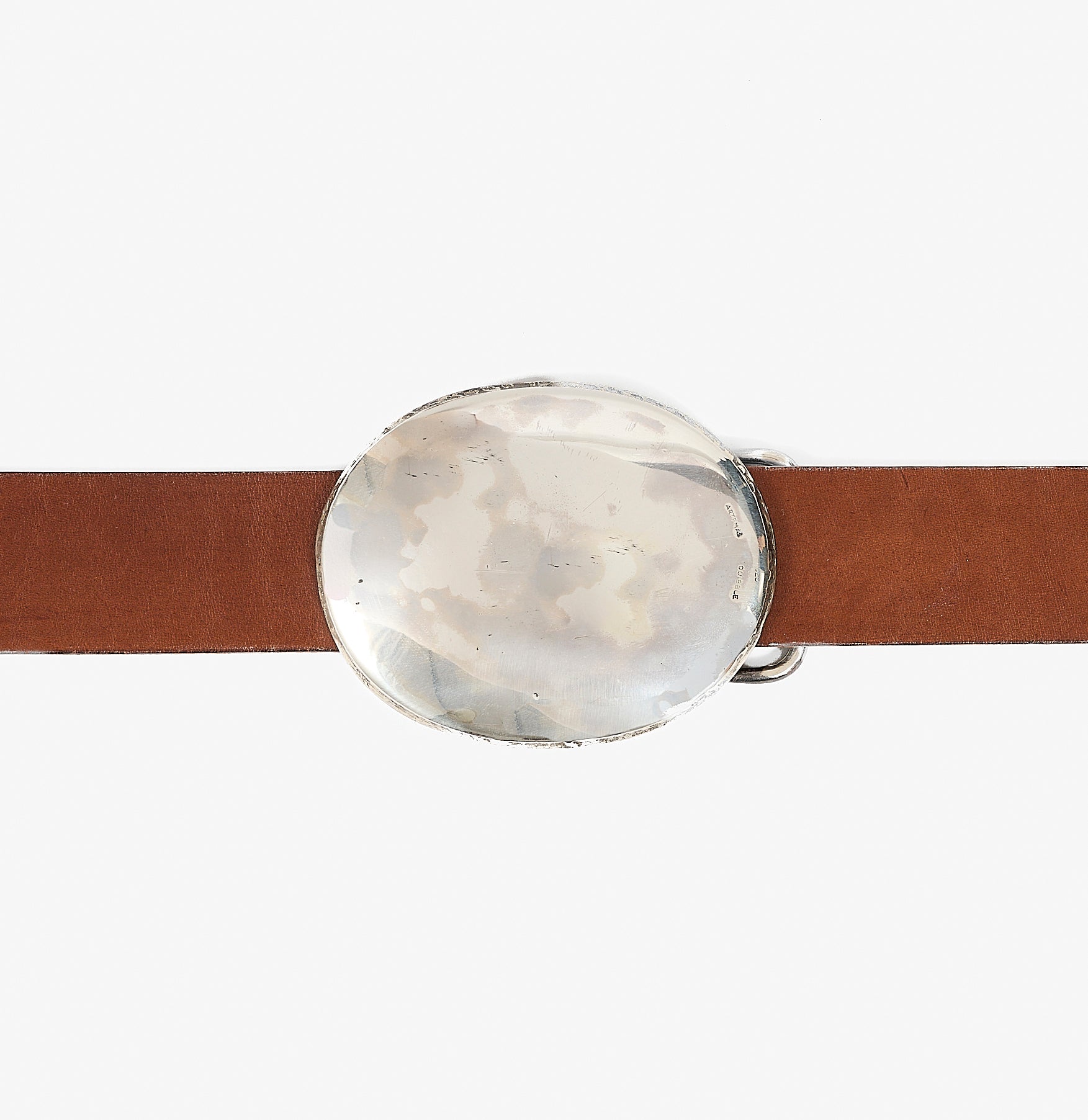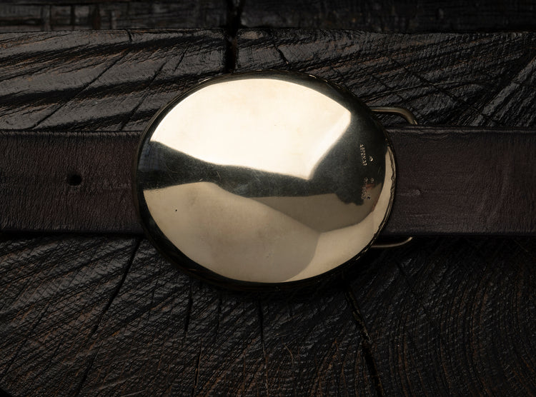 A solid oval abstraction of a western trophy belt, raw and primitive, cast from our own hand hammered sterling silver original.